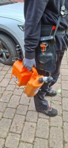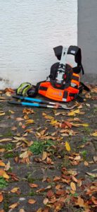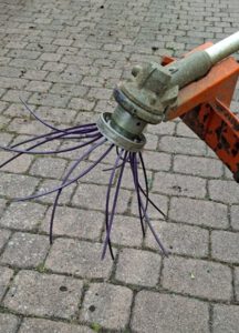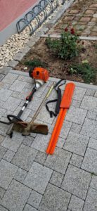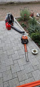 Die Fugen zwischen den Pflastersteinen wurden mit einem Fräsaufsatz auf der Motorsense gesäubert, und der Heckenschnitt sowie das Wurzelwerk wurden verladen. Das Grüngut wurde auf einen großen Hänger geladen und ein weiterer, kleinerer Hänger wurde mit Bauschutt und Restmüll beladen. Da das Schnittgut nicht auf einmal Platz fand, musste sogar zweimal zum Häckselplatz nach Michelbach gefahren werden.