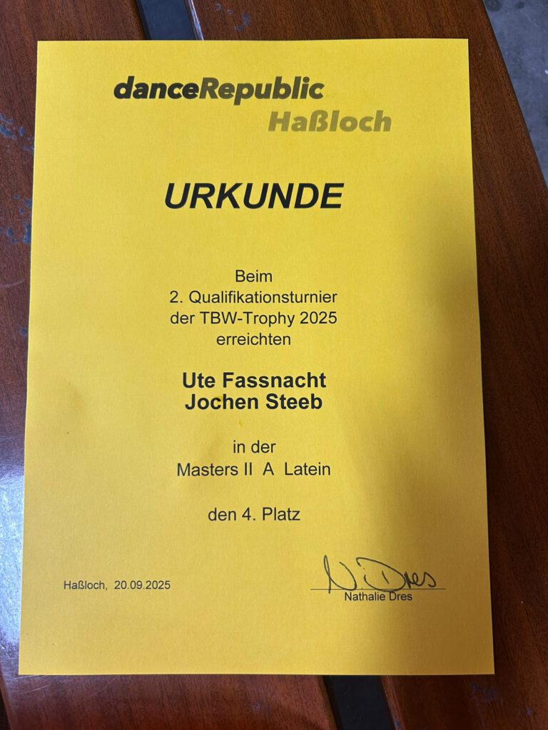 Jochen Steeb und Ute Fassnacht haben ein ganz starkes Comeback hingelegt – nach über 25 Jahren Turnierpause sind sie gleich wieder voll dabei: Bei der TBW-Trophy Masters II – V am 20. und 21. September 2025 in Haßloch zeigten sie in der Master II A Latein, in einem starken Feld mit zehn Paaren, dass sie es noch draufhaben: Der 4. Platz, nur knapp am Treppchen vorbei – das war ganz souverän.