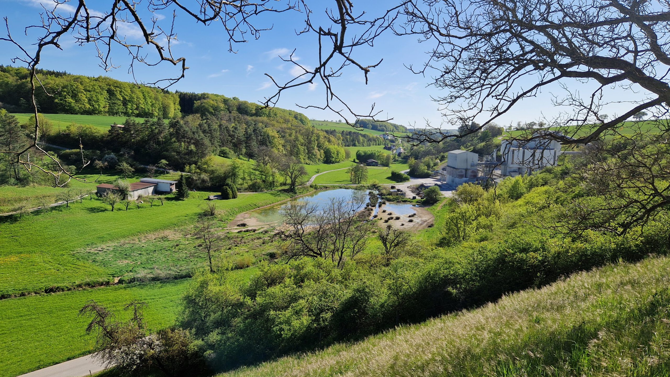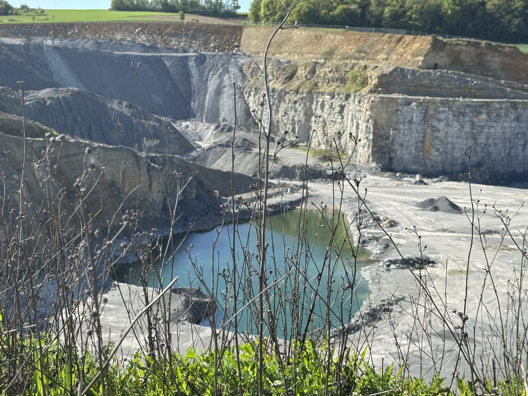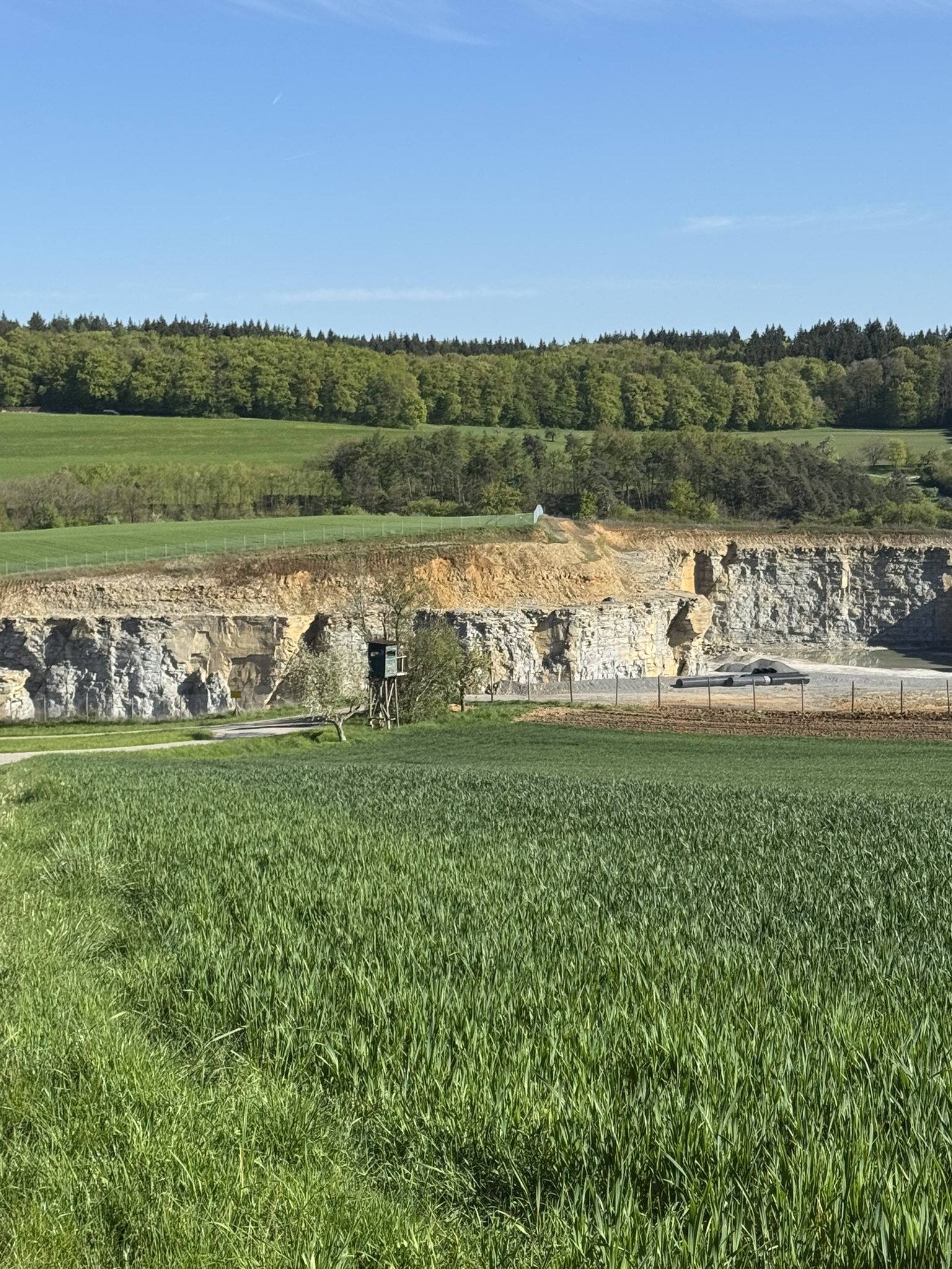 Schon zu Beginn der Tour beeindruckten die weiten Felder, sanften Hügel und lichten Waldränder, die das Landschaftsbild prägen. Unser Weg führte zunächst zum ehemaligen Steinbruch von Laibach, der bis heute ein spannendes Fenster in die Erdgeschichte bietet. Hier wurde einst Muschelkalk abgebaut – ein Gestein, das vor rund 240 Millionen Jahren in einem flachen Meer entstand. Die markanten Felswände geben noch immer Einblicke in diese urzeitlichen Schichten und machen den Ort zu einem besonderen Highlight.